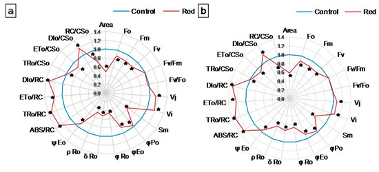 Chl a fluorescence was measured to describe the efficiency of PSII photochemistry. The values of the measured and calculated PSII parameters were normalized against the control (set as 1) and presented on radar charts (Figure 2a,b). Raw values of these parameters are presented in the Supplementary Materials: Table S1. The fluorescence parameters (minimum (F0), maximum (Fm), and variable (Fv) fluorescence) decreased significantly in both types of lettuce examined grown in the red glasshouse compared to the control (Figure 2a,b, Table S1). The maximum quantum yield of PSII (Fv/Fm) and the activity of the water-splitting complex (Fv/F0) did not change in the red glasshouse in both types of lettuce (Figure 2a,b, Table S1). The relative variable fluorescence at 2 ms (VJ) and relative variable fluorescence at 30 ms (VI) increased significantly in both types of lettuce examined cultivated in the red glasshouse (Figure 2a,b, Table S1). The reduced plastoquinone pool (Area) and total electron carriers per reaction center (RC) (Sm) decreased in both lettuce types in the red glasshouse (Figure 2a,b, Table S1). The parameters describing yield or flux ratios (φPo, φEo, φRo, δRo, ρRo, and ψEo) decreased significantly in the tested plants cultivated in the red glasshouse (Figure 2a,b, Table S1). Specific fluxes or activities per RC (ABS/RC, TRo/RC, ETo/RC, and DIo/RC) increased significantly in butterhead and iceberg lettuce (Figure 2a,b, Table S1). The trapped energy flux per cross-section (CS) (TRo/CSo) and electron transport flux per CS (ETo/CSo) decreased, while the dissipated energy flux per CS (DIo/CSo) increased in both butterhead and iceberg lettuce (Figure 2a,b, Table S1), whereas, the amount of active PSII RCs per CS (RC/CSo) decreased significantly also in both examined lettuce types cultivated in the red glasshouse in comparison to the control glasshouse (Figure 2a,b, Table S1).