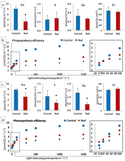 Photosynthesis efficiency of (a,b) butterhead and (c,d) iceberg lettuce types cultivated in transparent (control) and red glasshouses: (a,c) net photosynthesis (Pn), stomatal conductance (Gs), transpiration (E), and intercellular CO2 concentration (Ci) at 300 μmol quanta·m−2·s−1; (b,d) leaf and stem photosynthesis efficiency; * statistically significant differences within each parameter at p ≤ 0.05; (n = 3).