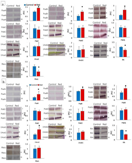 Structural and functional photosynthetic proteins content of (a) butterhead and (b) iceberg lettuce types cultivated in transparent (control) and red glasshouses; amount of protein loaded per lane—10 μg for Lhcb1, RbcL; 5 μg for PsaA, PsaB, PsbB, PsbC, PsbQ, Lhca1, RA; 3 μg for PsbO; content of proteins expressed as relative units (RU) in reference to the mean area value for the control on each gel expressed as 1; for the protein names, see Material and Methods (2.3.4); I, II, III—replications; * statistically significant differences within each parameter at p ≤ 0.05; (n = 3).