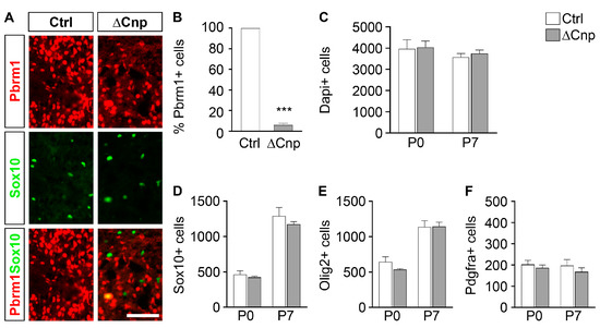 By combining the Pbrm1fl allele [18] with the Cnp1Cre allele [19], we specifically targeted the floxed Pbrm1 allele in oligodendroglial cells of the spinal cord in their late OPC stage. Co-immunohistochemical staining and quantification revealed that Pbrm1 was effectively deleted in the vast majority of oligodendroglial cells by P0, with only 6.3 ± 1.5% of all Sox10-expressing cells still positive for the protein (Figure 2A,B). At the same time, Pbrm1 deletion in the spinal cord was restricted to the oligodendroglial population.