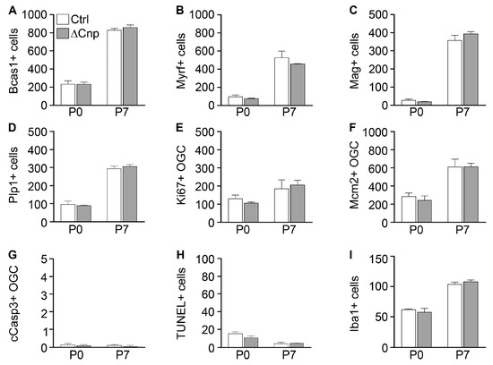 Pbrm1 deletion in late spinal cord OPCs has no effects on oligodendroglial proliferation, cell death and differentiation. (A–I) Determination of the absolute number of Bcas1 (A), Myrf (B), Mag (C) and Plp1 (D) expressing cells, the Ki67- (E), Mcm2- (F) and cleaved caspase 3- (cCasp3, (G)) positive oligodendroglial cells (OGC), TUNEL signals (H) or Iba1-positive microglia (I) per spinal cord section in control (Ctrl, white bars) and Pbrm1∆Cnp (∆Cnp, grey bars) mice at P0 and P7. Data were obtained from immunohistochemical stainings (A,B,E–I) and in situ hybridizations (C,D) and represent mean ± SEM (n = 3). No statistically significant differences were obtained.