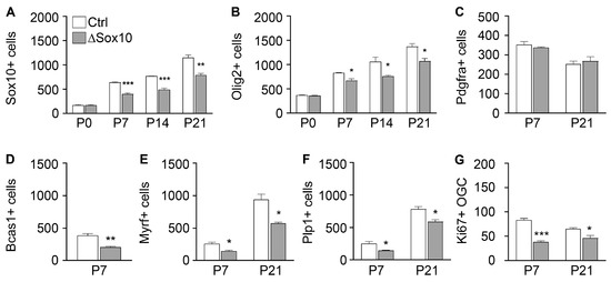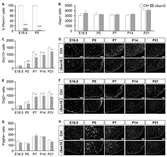 Again, the counting of cell numbers in the spinal cord from Dapi signals failed to reveal significant alterations in Pbrm1∆Sox10 mice as compared to controls over the whole period of analysis from E16.5 to P21 (Figure 4B). Overall numbers of Sox10- or Olig2-positive oligodendroglial cells were also initially comparable at E16.5, but became lower in Pbrm1∆Sox10 mice at P0 by approximately 23–30% (Figure 4C–F). This reduction remained stable throughout the first three postnatal weeks (i.e., 20–28% at P21 depending on marker). Interestingly, it did not affect the Pdgfra-positive OPC population. Their numbers remained similar in both genotypes at all times analyzed (Figure 4G,H).