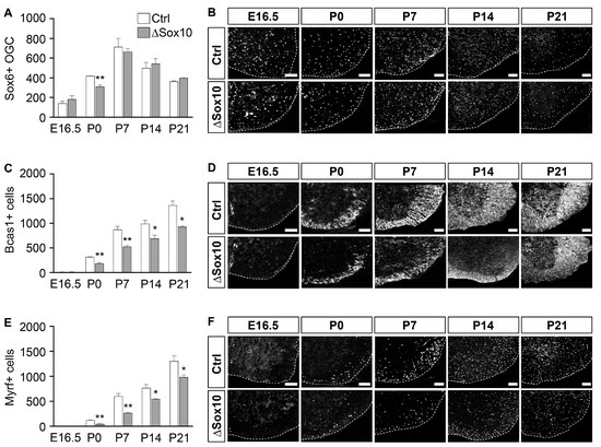 Pbrm1 deletion in early OPCs affects numbers of pre-myelinating oligodendrocytes in the spinal cord. (A–F) Determination of the absolute number of Sox6- (A), Bcas1- (C) and Myrf-positive (E) oligodendroglial cells per spinal cord section in control (Ctrl, white bars) and Pbrm1∆Sox10 (∆Sox10, grey bars) mice at E16.5 and during the first three postnatal weeks. Data represent mean ± SEM (n = 3). They were obtained from immunohistochemical stainings. Representative spinal cord images (ventral right quarter, marked by dotted line and placed on black background) are shown for Sox6 in (B), Bcas1 in (D) and Myrf in (F). Scale bar: 100 µm. Differences from control were statistically significant as indicated (Student’s t test; *, p ≤ 0.05; **, p ≤ 0.01).