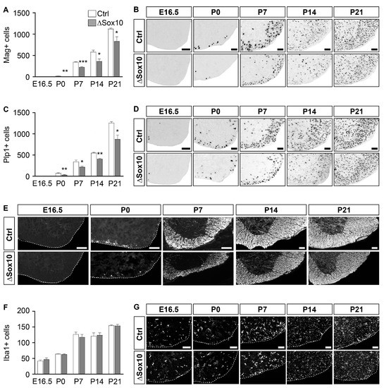 Additional confirmation for this finding came from in situ hybridizations for Mag and Plp1 (Figure 6A–D). Cells positive for Mag or Plp1 were substantially fewer in Pbrm1∆Sox10 mice at P0, when they became detectable. By P21, the difference in Mag- or Plp1-positive oligodendrocytes between genotypes roughly matched the overall difference in oligodendroglial cells. This 26–31% difference in myelinating cells at P21 was, however, difficult to detect by Mbp immunostaining (Figure 6E). Differences in Mbp signal intensities were more obvious at P0 and P7. Staining of microglia with Iba1 as a marker did not yield any signs of an inflammatory response to the reduced number of pre-myelinating and myelinating oligodendrocytes (Figure 6F,G).