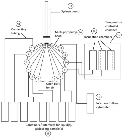 Scheme representing the components and connections of the OC-300 automation unit. (1–12) are the different ports for the connections to the different reagents, chambers and interface to the flow cytometer located in the multi-port pump head (14). (13) is the syringe pump. (15) is the temperature-controlled chamber with the incubation chambers (17) inside it. (16) is the interface that connects the OC-300 to the flow cytometer. (18) represents the tubing used for all the connections, and finally, (19) represents all the different flasks for the necessary reagents and solutions. Modified from Hammes and Weilenmann (2019) [42].