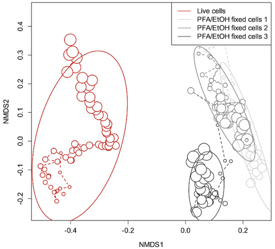 Divergence of the composition of the MCs, processed either from live cells or pre-fixed cells, measured and visualized by an NMDS plot: increasing size of circles represents an increasing time of sampling. Red shows the experiment conducted using live cells as input samples for the online OC-300 procedure. Different shades of gray represent the three experiments using PFA/EtOH pre-fixed cells (1–3) as input samples for the automated workflow. Ellipses represent the confidence region for each experiment with an alpha = 0.8.