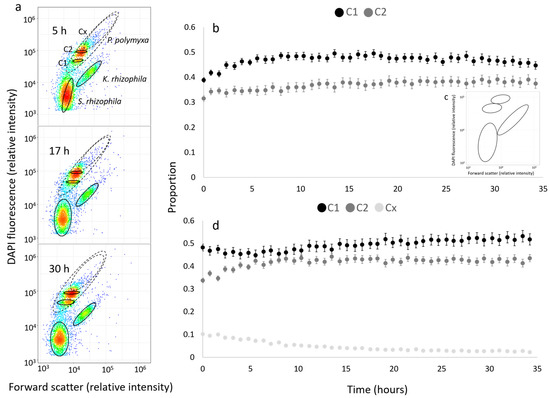 However, especially for the pre-fixed P. polymyxa measurements, we found an increasing trend in the cell number over time (Figure 4b,d,f). In parallel, the forward scatter of the P. polymyxa was decreasing. The other parameter in the 2D plots is the DAPI fluorescence, which provides information on the number of chromosomes per cell. For P. polymyxa, two subpopulations were found, with the C1 subpopulation comprising single cells with one chromosome content, whereas the C2 subpopulation contained cells with double chromosome content. The DAPI fluorescence intensity of the C1 subpopulation was 5–6 × 104 relative DAPI intensity units, whereas, for the C2 subpopulation, the value was 1 × 105 relative DAPI intensity units, thus supporting this assumption. The cells of subpopulation C2 may be cells whose higher numbers of chromosomes indicate that they may still be interconnected duplicate cells that have not yet undergone complete cell division. In order to assess whether the increase in cell concentration and the decrease in a forward scatter of pre-fixed P. polymyxa cells were related, the bioinformatics tool flowEMMi v2 [37], which was specifically developed for the automatic gating of cell subpopulations in 2D plots, was used. A gate template out of the 132 pre-fixed samples from Figure 4 was created by flowEMMi v2 (Figure 6c), which was used to calculate the number of cells in the subpopulations C1 and C2 of P. polymyxa in addition to the cell numbers of S. rhizophila and K. rhizophila. In P. polymyxa, it was found that the cell number in subpopulation C1 increased significantly, while the number in subpopulation C2 increased only slightly. This increase in cell number per subcommunity goes along with a decrease in forward scatter, thus confirming that stirring the fixed samples might cause breakage of doublet cells or smaller cell aggregates. This is even further confirmed by the use of a different but manual gating procedure (FlowJo, Supplementary Information SI 2.6), in which a third subpopulation of P. polymyxa (Cx, 2–3 × 105 mean relative DAPI intensity units) clearly decreased in cell abundance over the 34 h of stirring (Figure 6d). In Figure 6d, we can see that at the start, the Cx subpopulation has a proportion of 0.10; however, as time passes by, this reduces until it disappears almost completely. Additionally, the subpopulation comprising single cells (C1) increases constantly over time, while the C2 subpopulation had an initial increase in cell number and then remained constant.