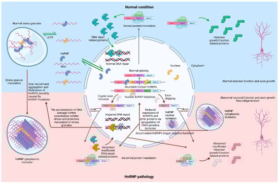 Under cellular stress, hnRNPs are able to form into stress granules by liquid–liquid phase separation to regulate protein translation towards promoting survival. Mutant hnRNPs exacerbate the recruitment of hnRNPs to stress granules, causing them to lose their reversibility and mature. Mature stress granules, accumulated with large amounts of hnRNPs and RNA, form insoluble amyloid-like fibrils and aggregates. The accumulation of hnRNPs in the inclusions causes their nuclear depletion, which leads to a series of splicing abnormalities, including cryptic exon inclusion and exon skipping. Most of the aberrant NMD-sensitive transcripts are degraded via the NMD pathway, while the remaining aberrant mRNAs are translated into abnormal proteins or have reduced protein levels due to the premature termination of translation. Some of these abnormal or deficient proteins lead to compromised DNA damage repair and others lead to abnormal neuronal function such as abnormal axonal growth. This would lead to further accumulation of cellular stress, promoting the maturation of stress granules, while the accumulation of hnRNPs in the nuclear and/or cytoplasmic inclusions could downregulate their expression through negative feedback autoregulation. However, this autoregulatory effect through the upregulation of NMD-sensitive isoforms would simultaneously decrease the expression of other proteins. Together, these processes lead to a vicious cycle and eventually result in neurodegeneration. Created with BioRender.com.