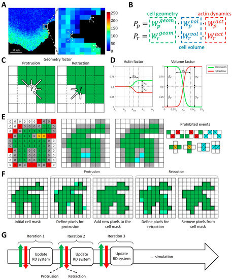 Taking these considerations into account, we define the probabilities of protrusion and retraction with three contributing factors: local geometry (local curvature of the cell membrane), overall time-dependent cell volume (change in the size of the simulation domain), and local actin polymerization (controlled by the activity of GTPases in the RD model) (Figure 1B). Specifically, we define