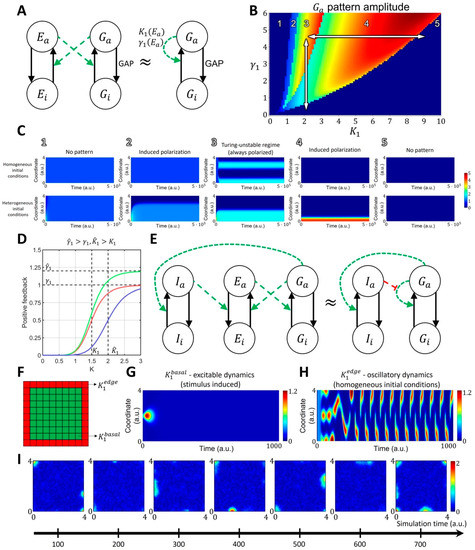 In the extended models with regulator (inhibitor ), we began with the setting , , We then manually adjusted the parameters governing the inhibitor dynamics, as well as the GTPase response to the inhibitor, to capture excitable and oscillatory dynamics. In all models, the values of membrane-bound and cytosolic proteins were set as and , respectively. The value of the parameter was set differently at the border of the simulation domain. Based on the experimental evidence [15,54,56,57], we assumed that the GTPase activity remained high at the very edge of the cell. Thus, for the region at the boundary of the simulation domain, we used , while we used for the interior nodes (see Figure 2F).