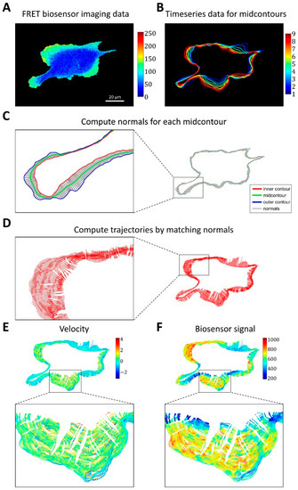 Image analysis pipeline for simultaneous analysis of cell edge velocity and biosensor signal. (A) The input of the pipeline consists of time series of FRET biosensor data in cells. (B) The time-series data were split into time intervals of 20 frames, and for each time interval a mid-contour was computed. (C) For each vertex of the computed mid-contour, the perpendicular lines were found and their intersections with the inner and outer contours defined the normals (i.e., segments between the inner and outer contours perpendicular to the mid-contour). (D) Cell membrane trajectories were computed by matching the closest normals. (E,F) Cell edge velocity and biosensor signal were tracked along the computed trajectories at the points of intersection with the cell edge.