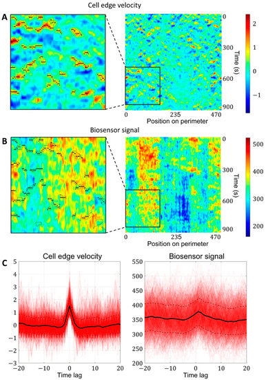 Simultaneous analysis of cell edge velocity and biosensor signal in the neighborhood of local maxima of cell edge velocity. (A) In the resulting velocity kymographs, we defined the areas of increased velocity values (black outlines) and found the points of local maxima within these regions (black dots). (B) The points of local maxima were transferred from the velocity kymograph to the kymograph with biosensor signal kymograph. (C) Both for velocity and biosensor signal, the values in the neighborhood of the identified points were extracted from kymographs and averaged to obtain the relative temporal comparison.