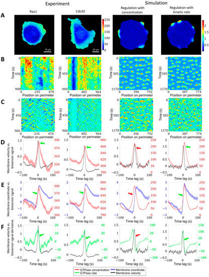 Regulation of GTPase activation by GTPase activation rate. We performed the same analysis for Rac1 and Cdc42 data in a breast cancer cell line and in two simulation setups, where actin factor in the model is regulated by the absolute value of the GTPase concentration and by the kinetic rate of GTPase activation. (A) Snapshots of GTPase activity (colormaps represent FRET biosensor signal in experimental images and active GTPase concentration in simulations). (B) Kymographs of GTPase activity. (C) Kymographs of cell edge velocity. (D) Comparison of cell edge velocity and biosensor signal (GTPase concentration). (E) Comparison of cell edge coordinate and biosensor signal (GTPase concentration). (F) Comparison of cell edge velocity and temporal derivative of biosensor signal (GTPase concentration). Features that are inconsistent with the experiment are marked with red arrows. Green arrows indicate agreement with the experiment.