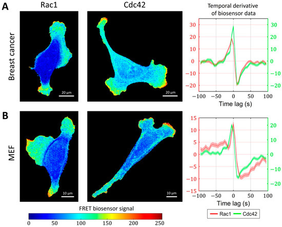 Simultaneous and delayed activation of Rac1 and Cdc42. (A) Breast cancer cell line shows coherent activation of Rac1 and Cdc42. (B) A delay between Cdc42 and Rac1 is observed in an MEF cell line.