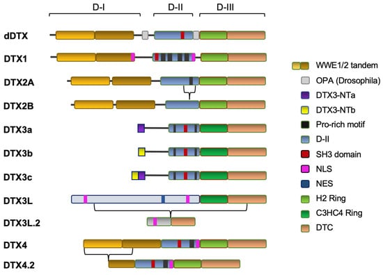 DTX protein expression is almost ubiquitous in mammalians, although they display the highest expression in specific cell and tissue types like blood vessels, embryonic neural tissues, genital and reproductive apparatus, pancreas, lungs, liver, kidneys, adrenal gland, skin, intestinal epithelial components and muscle (see Uberon Anatomy Ontology at https://bioportal.bioontology.org/ontologies/UBERON accessed on 17 May 2023 []). A first hint at the physiological role of DTX proteins has come from a DTX Drosophila gene null mutant study which confirmed the tissue-specific requirement for DTX expression and its dispensable role in embryo development []. This is consistent with the finding that T-cells, a DTX1 and 2 expressing mammalian cell type, can develop normally in absence of both DTX1 and DTX2 []. On the other hand, overexpression of DTX proteins in mammalian systems has been found to affect myogenesis, neurogenesis [] and the proper function of lymphoid organs []. More recently, DTX protein expression in cancer cells has revealed a wide landscape of contextual functions linked, in part, to their regulation of NOTCH signaling. As graphically summarized in Figure 1, mammalian DTX proteins share all or part of the Drosophila DTX (dDTX) progenitor structure [,]. As such, some phylogenetic and intra-species key comparative points can be made per each Drosophila reference domain structure in order to better understand the emerging cellular and systemic functions of DTX proteins in mammalians. In particular, human DTX proteins are linked to the expression of five paralog genes along with their main isoform variants (Table 1 and Figure 1). A number of human isoform variants have been reported for DTX proteins (Figure 1). These are discussed below in relationship with the underlying protein domain features.