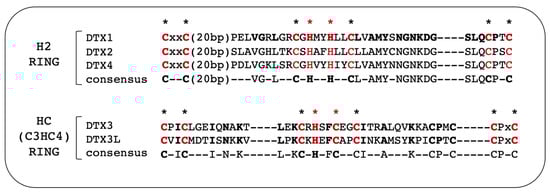Sequence comparison and consensus (bold) of the RING motifs in DTX proteins. Bolded sequences, consensus sequence within each RING category, red letters under the asterisk indicate consensus residues shared among all DTX proteins RING motifs; black asterisks are the conserved C residues concurring to the Ring domain numbering; red asterisks correspond to positions in the RING domain alignment supporting the H2 versus HC RING acronym.