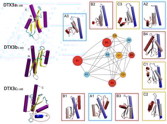 DTX3 isoforms N-terminal domain (N-terminal 100aa) predicted tridimensional structure. The structures projections shown on the left were selected to display the different N-terminal end orientation of DTX3c (in the red dotted circle) compared to isoforms a and b. The diagram on the right displays different projections of the DTX3 isoform Nt-100 structures shown on the left corresponding to the computational nodes (in the center) calculated out of 40,000 potential conformations (adapted from Scalia et al. 2023 []). The functional implications of DTX3c unique N-terminal spatial configuration are discussed in the text.