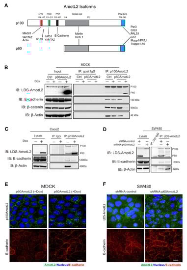 p100 and p60AmotL2 are identical in amino acid sequence, the exception being that the N-terminal domain of p100 contains PXPPY motifs that are responsible for interactions with actin, MAGI1b and YAP1 (Figure 1A). Additionally, there is an 87 a.a. sequence within the N-terminal domain that is also required for the interaction between p100AmotL2 and VE/E-cadherin [33,34]. The Amot family members may also form hetero or homo oligomers with each other, mediated by coiled-coil domains [29,32]. We hypothesized that p60AmotL2 might associate with p100AmotL2 and antagonize its normal function in a dominant-negative fashion. To test this hypothesis, we used Madin–Darby Canine Kidney cells (MDCK), commonly used for studies of cell–cell adhesion, polarity and the formation of 3-D structures in collagen. The MDCK cells were transfected with a doxycycline (Dox)-inducible p60AmotL2 construct (MDCK p60AmotL2), as previously described [44]. As shown in Figure 1B, the addition of Dox resulted in the induction of p60AmotL2 expression. We used an antibody targeting the N-terminal domain of p100AmotL2 for an immunoprecipitation analysis. The immunoprecipitation analysis using p100AmotL2-specific antibodies showed that p60AmotL2 and p100AmotL2 formed a complex. Furthermore, the induction of p60AmotL2 abrogated the association of p100AmotL2 to E-cadherin, β-catenin and actin (Figure 1B). The MDCK cells are immortalized but not transformed. We, therefore, assessed whether these data were valid also in human cancer cells. For this purpose, we transfected doxycycline-regulated p60AmotL2 in the colon cancer cell line Caco2. Caco2 cells maintain E-cadherin junctions and polarize when grown in 3-D matrices. As shown in Figure 1C, the p60AmotL2 expression inhibited the association of p100Amotl2 to both E-cadherin and actin.