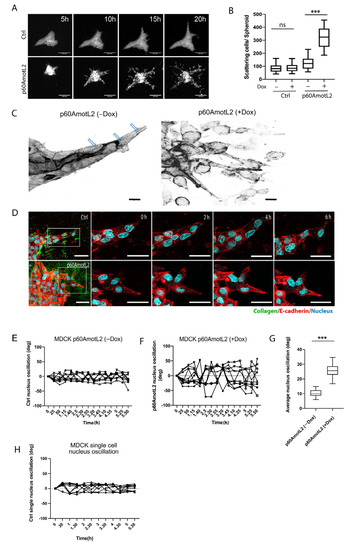 During tubulogenesis, the control cells form sprouts with leader or leader cells connected to stalk cells, similar to the spatial coordination of endothelial cells observed during angiogenesis [51]. Immunofluorescent staining of the filamentous actin revealed the presence of long actin fibers connecting leader cells with stalk cells (Figure 3C and Figure S2). However, these longitudinal fibers were not detected in cellular buds emerging from p60AmotL2 cysts. We then used real-time microscopy to visualize the actin filaments and nuclear movements in p60AmotL2-expressing MDCK cells. The cells were labeled with SiR-actin dye and NucBlue to visualize the actin filaments and nuclei, respectively. Time-lapse imaging of the control cells showed that leader cell nuclei moved in the direction of the forming tube and that the nucleus elongated to align with the direction of collective migration (Figure 3D and Video S3). Interestingly, the nuclei of p60AmotL2-expressing cells appeared disconnected from the actin cytoskeleton, as nuclear oscillation was observed within the cells (Figure 3E–G and Video S4). In contrast, the single MDCK control cells grown in collagen did not exhibit a similar type of nuclear oscillation (Figure 3H). The same phenotypic changes were observed in adenoviral-p60AmotL2 infected cells (Figure S3).