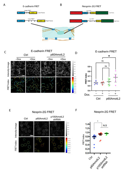 Figure 6F presents a hypothetical model suggesting that mechanical force may be transmitted from cell–cell junctions to the nuclear membrane through the p100AmotL2 protein complex. Additionally, this model proposes that p60AmotL2 disrupts the transmission of mechanosignals between cell–cell junctions and the nucleus. To examine this further, we measured the forces exerted on cellular junctions and the nucleus using fluorescence resonance energy transfer (FRET)-based biosensors for E-cadherin and Nesprin-2 (Figure 7A,B). When force is applied to these biosensors, two fluorescent tags (mTFP1 and EYFP/Venus) are displaced from each other, resulting in a change in FRET. Our findings indicate that both p60AmotL2-expressing cells and p100AmotL2-depleted cells display a higher FRET index (lower force) for the E-cadherin and Nesprin-2 biosensors (Figure 7C–F).