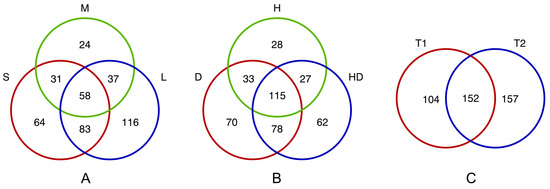 Venn diagrams visualizing the number of differentially expressed proteins in flag leaves, specific and shared between: (A) barley genotypes assigned to groups of different size of flag leaf (S, M, L), (B) applied stress treatments (D, H, HD), and (C) time points (T1, T2).