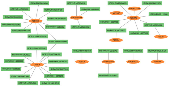 In total, there were 10 DEPs significantly associated with 40 DEGs (Table S6). The largest number of significant correlations (12) was found for the protease inhibitor Q40036. The gene HORVU3Hr1G067350 (annotated to B3 domain-containing transcription factor FUS3 according to Ensembl Plants) exhibited the strongest correlation with this protein. Ten genes were associated with F2D3S4, described as low-temperature-induced 78 kDa/65 kDa protein (Interpro database). This protein showed the most significant correlation to the gene HORVU4Hr1G050930 (cytochrome P450), and also to three genes annotated to the SANT/Myb domain (HORVU0Hr1G007770, HORVU0Hr1G010940, and HORVU7Hr1G083690 being orthologs of Arabidopsis GLK2 genes). Interestingly, we identified the relationship between dehydrin (A0A0S1LGH4) and expression change of four genes: two were annotated to ankyrin repeat, one was related to ATC domain, and one gene encoded LEA2, which was also associated with the regulation of the F2D3S4 protein. We found that F2E325–glutaredoxin protein (according to Interpro database) was correlated with expression of the gene HORVU1Hr1G021650 engaged in defense response through thaumatin.