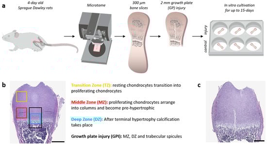 Experimental setup of ex vivo model preparation and zone specification. (a) 4-day-old Sprague Dawley rats were sacrificed and the left and right femur were explanted and processed into 300 µm thick bone slices by vibratome. With a 2 mm long razor blade, a vertical injury from the center of the epiphysis through the growth plate (GP) into the bone marrow cavity was inflicted in the left femur slice; (b) The respective right femur slices served as a control. Bone slices with and without injury were cultivated for up to 15 days. (b) Hematoxylin and eosin staining (H&E) shows the specific zone evaluated during histological staining. Transition Zone (TZ, yellow), Middle Zone (MZ, red), Deep Zone (DZ, blue), and growth plate injury area (GPI, black). (c) Maximum injury inflicted on the day of preparation (0). Scale bar = 500 µm.