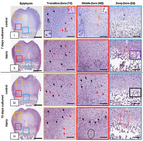 Hematoxylin and eosin (H&E) staining demonstrated the interruption of endochondral ossification due to GP injury. (i–iv) Representative images of rat distal femur OTCs with and without injury at day 7 and day 15 and their respective controls stained with H&E. Colored squares represent the transition zone (TZ, yellow), middle zone (MZ, red), and deep zone (DZ, blue). Black arrow = active chondrocytes (black box with higher magnification), red arrow = prehypertrophic chondrocytes (red box with higher magnification), blue arrow = proliferating chondrocytes (blue box with higher magnification), orange arrow = (pre)hypertrophic chondrocytes (orange box with higher magnification), purple arrow = chondrocyte hypertrophy, green arrow = disintegrated hypertrophic chondrocyte, black dashed circle = stacks of proliferating chondrocytes, purple rectangle = layers of hypertrophic chondrocytes, black rectangle = matrix septa, and black oval = clusters of multicellular columns; scale bar: epiphysis = 500 µm, TZ/MZ/DZ = 150 µm, higher magnification = 40 µm.