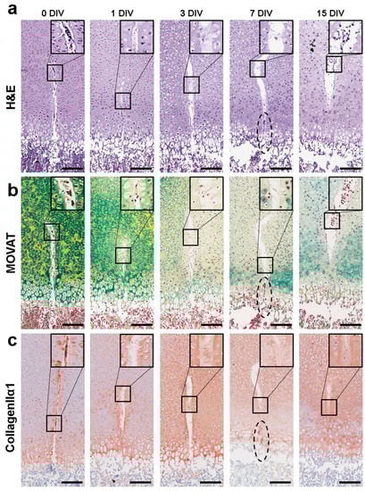 Growth plate injury regeneration of ex vivo bone slices under in vitro culture. To assess growth plate (GP) injury regeneration we performed (a) hematoxylin and eosin (H&E) and (b) Movat’s Pentachrome histological staining, and (c) type-IIα1 collagen (Col2α1) immunohistochemistry. Representative images of bone slices at 0, 1, 3, 7, and 15 days in vitro (DIV) are shown with higher magnification of newly formed structures within the injury wound. Black dashed oval = cell aggregation, which was detected within all performed stainings. Scale bar = 150 µm.