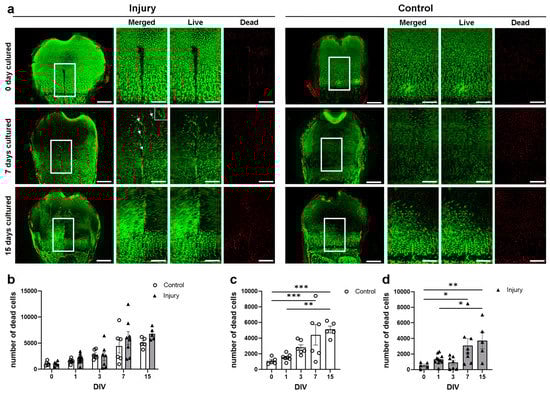 Determination of tissue viability surrounding the growth plate injury and survival in vitro. (a) Live and dead staining was performed to assess tissue viability by AM and EthD-1. Imaging of injured bone at 0, 7, and 15 days in vitro (DIV) was performed using a laser confocal microscope. Green = live cells, red = dead cells; white arrows—elongated cells; scale bar = 150 µm; higher magnification = 40 µm; (b–d) Dead cells within the injury area were quantified and the statistical significance of the observed difference was tested with Mann–Whitney U test (change by treatment) or Kruskal–Wallis test (temporal changes). Data are summarized as the mean ± SEM, and actual data were overlaid on histograms as triangles (injury) and circles (control) n ≥ 4, * p ≤ 0.05, ** p ≤ 0.01, *** p ≤ 0.001.