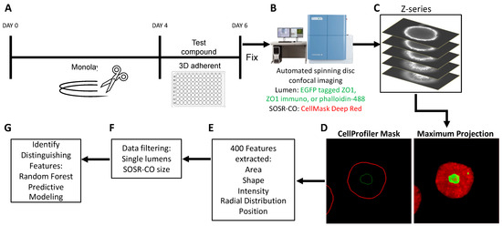We have previously reported a protocol for generating self-organizing single rosette spheroids with manual imaging and analysis [37]. To dramatically increase the throughput and decrease human bias, we have developed an entirely automated pipeline for imaging and analysis. First, we generated the neuroepithelial monolayer by four inhibitor treatment of iPS cells for 4 days. At this time, we cut the monolayer into identically sized fragments and added the fragment suspension into a 96-well plate coated with Geltrex hydrogels (Figure 1A). After 48 h of exposure, the cultures were paraformaldehyde fixed and stained. We then utilized a Yokogawa CV8000 automated dual microlens confocal to generate 10× images of each well of the 96-well plate containing on average 20–40 SOSR-COs per well (Figure 1B). The confocal optical sections were compressed into a maximum projection image (Figure 1C). Utilizing a CellProfiler pipeline, each SOSR-CO was identified from these images, as well as the central lumen labeled with either ZO1-EGFP fusion protein, ZO1 antibody, or phalloidin for labeling f-actin (Figure 1D). Over 400 features, including shape, fluorescence intensity, radial distribution, and area metrics, were extracted from the images (Figure 1E). The SOSR-CO datasets were then filtered for individual lumens and size (7800–31,415 µm2). We used these filters to exclude SOSR-COs that resulted from the fusion of multiple monolayer fragments, as shown in our previous preprint manuscript [37]. To identify the distinguishing features of particular treatments or genetic variants, we utilized the random forest predictive model, followed by inspecting the individual feature importance. For pharmaceutical treatments, linear regression random forest decreases the risk of false feature identification. The distinguishing features were then validated by univariate comparisons and statistical testing.