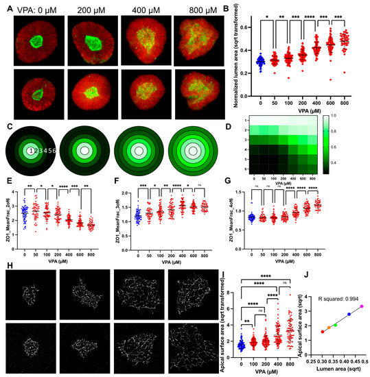 VPA causes a dose-response increase in SOSR-CO lumen size due to reduced apical constriction. (A) Example images of automated microscopy images of SOSR-COs treated with 0, 200, 600, and 1000 µM VPA. Green is ZO1-EGFP and red is HCS CellMask Deep Red. (B) SOSR-CO lumen size (normalized to total SOSR-CO area and square root transformed) is plotted for VPA doses from 50 to 1000 µM. Data from replicate independent experiments collected by manual imaging and analysis are presented in Figure S1a. (C) Mean fraction of radial distribution plots (maximum normalized) for ZO1-EGFP fluorescence are depicted for the 4 concentrations in A. Each concentric ring represents the 6 concentric rings of equal thickness generated from each individual SOSR-CO and averaged for each group. Legend in D. (D) Heatmap of mean fraction radial distribution of ZO1-EGFP fluorescence across the entire VPA dose-response curve. Intensity is shown by 3 color heatmap, with white as the highest intensity, black as the lowest, and green as intermediate. (E–G) Quantitative data for radial distribution of EGFP-ZO1 in rings 2, 3, and 4 for the VPA data set. Each dot is an individual SOSR-CO. n = 63, 54, 66, 64, 68, 69, 45, and 32, respectively, for (B,E–G). (H) Example 100× confocal images of tight junctions on the apical lumen surface labeled by ZO1 immunostaining with increasing VPA concentrations (0, 200, 400, and 800 µM, respectively). (I) The size of individual cell apical surfaces as measured by the space outlined by the ZO1-EGFP-labelled tight junction is plotted. Kruskal–Wallis statistical test was performed with Dunn’s multiple comparison post hoc between groups. (J) XY scatter plot comparing the lumen max projection area to cell apical surface area means at each concentration of VPA. Colors are for increasing doses of VPA (red = 0, orange = 100, green = 200, blue = 400, and magenta = 800 µM VPA). Line and R2 value for linear regression analysis. Dose comparisons for (B,E–G) were performed by one-way ANOVA with FDR corrected post hoc test between groups. Bars are mean and standard deviation. * p < 0.05, ** p < 0.01, *** p < 0.001, **** p < 0.0001, ns p > 0.05.