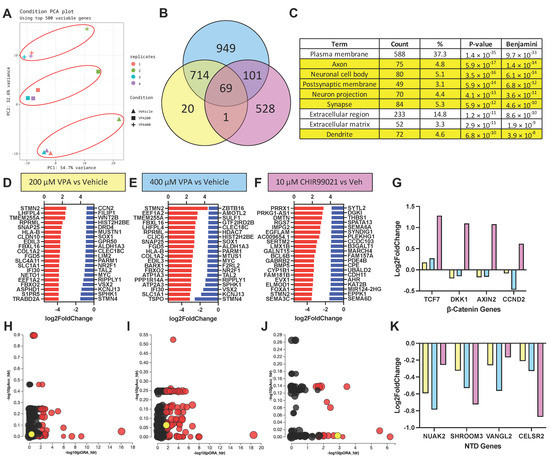 VPA causes transcriptomic signatures of neural differentiation, but not GSK3β inhibition. (A) Principal component analysis of VPA (200 and 400 µM) and vehicle-treated SOSR-CO mRNA sequencing analysis for 4 independent replicates. Red circles indicate treatment groupings. (B) Venn diagram of differentially expressed genes (DEGs) for 200 and 400 µM VPA and 10 µM CHIR99021 compared with vehicle control in SOSR-COs. Overlapping areas indicate the number of shared DEGs between treatment groups. (C) Gene ontology analysis of upregulated DEGs for 400 µM VPA treatment based on protein subcellular localization. Of the 9 top terms, 6 are neuron-specific (i.e., axon, dendrite, synapse). (D–F) The top 20 upregulated and downregulated transcripts for each treatment: (D) 200 µM VPA, (E) 400 µM VPA, and (F) 10 µM CHIR9901. (G) Log2 fold change in transcript levels for 4 canonical Wnt/β-catenin pathway regulated genes for each treatment. Only the GSK3β inhibitor CHIR99021 significantly increased the transcript levels for each of these genes. (H–J) Scatter plots of pathway GO terms by two significance scores (pORA: p-value for over-representation analysis, pAcc: p-value from total perturbation accumulation for the pathway) corrected for false discovery rate. A data table for significant terms is listed in Table S3. The yellow circle in each plot is the Wnt pathway. Red circle are significant GO-terms, and black circles are not significant. (H) 200 µM VPA, (I) 400 µM VPA, and (J) 10 µM CHIR99021. (K) Log2 fold change in transcript levels for 4 NTD-associated genes for each treatment. Both VPA and CHIR99021 decrease transcript levels for each of these genes.