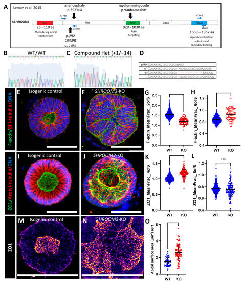 SHROOM3 knockout SOSR-COs have enlarged dysmorphic lumens, basal f-actin, and impaired apical constriction. (A) Schematic of human SHROOM3 gene with important locations, such as known human NTD variants, CRISPR cut site, and PCR primer locations [22]. (B,C) Sanger sequencing chromatographs for an isogenic control and compound heterozygous frameshift indel line using PCR primers AT789 and AT790. (D) The gRNA and indel sequences are listed. The “x” indicates the Cas9 cut site in the sequence. (E,F) Confocal images of SOSR-COs immunostained for β-III-tubulin and stained with f-actin dye and phalloidin-Alexa488. (E) Isogenic control has typical small round central lumen with radial tubulin structure. (F) SHROOM3-KO has enlarged dysmorphic lumen and basally localized f-actin. (G,H) Quantification of f-actin fluorescence radial distribution mean fraction in rings 2 and 6 compared with controls. n = 338 for WT and 83 for KO across 4 independent experiments. (I,J) Confocal images of SOSR-COs immunostained for acetyl-tubulin and ZO1. (I) Isogenic control has typical small round central lumen with radial tubulin structure. (J) SHROOM3-KO has enlarged dysmorphic lumen with large opening (max project is of the entire lumen Z-stack). (K,L) Quantification of ZO1 immunofluorescence radial distribution mean fraction in rings 4 and 6 compared with controls. n = 406 for WT and 164 for KO across 4 independent experiments. (I,J) Confocal images of SOSR-COs immunostained for acetyl-tubulin and ZO1. (M,N) Digital magnification of maximum Z-projection of one side of the lumen immunolabelled for ZO1 for isogenic control (M) and SHROOM3-KO (N). Fire LUT used to better see tight-junction edges. (O) Knockout cells have greater individual cell apical surface areas than isogenic controls. n = 61 for WT and 97 for KO. Each dot in (G,H,K,L) represents measurements for an individual SOSR-CO, while in (N), they represent individual apical cell surface areas. Bars are mean and standard deviation. Statistical analysis performed with Mann–Whitney test. Scale bars = 100 µm. ns p > 0.05.