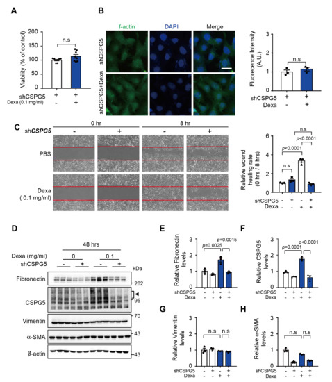 To determine the appropriate dexa concentration for further experiments, we assessed cell viability upon administration of 0.1 mg/mL and 0.5 mg/mL dexa and found it to be unaffected for 48 h. However, cell morphology was significantly altered (Figure S1). To evaluate the function of CSPG5, the protein was knocked down by transfecting HLE-B3 cells with a CSPG5 shRNA. The knockdown did not affect HLE-B3 cell viability for 48 h (Figure 2A). However, dexa-induced F-actin expression was suppressed in CSPG5 knocked-down HLE-B3 cells (Figure 2B). Furthermore, dexa-induced wound healing was significantly suppressed (Figure 2C). To understand this further, the epithelial–mesenchymal transition (EMT) markers related to cell migration were evaluated. The expression of fibronectin and CSPG5 was increased by dexa treatment, and this phenotype was suppressed by CSPG5 knockdown (Figure 2D–H). These results demonstrate that CSPG5 is involved in cell migration.