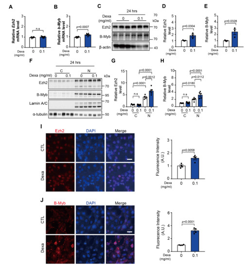 To identify the regulatory factors of CSPG5 in dexa-treated HLE-B3 cells, we focused on the transcriptional regulation of CSPG5. Previous reports on hepatocellular carcinoma indicated an association between the transcription factors EZH2 and B-Myb [17]. Therefore, the expression of these transcription factors was analyzed. Dexa did not affect the expression of EZH2 mRNA but increased B-Myb mRNA expression after 4 h of treatment after 24 h (Figure 3A–E). Comparative analysis of cytoplasmic and nuclear proteins revealed that dexa significantly increased the expression of EZH2 and B-Myb proteins in the nucleus (Figure 3F–H). Immunofluorescence assay further confirmed that the expression of both EZH2 and B-Myb was significantly increased by dexa in the nucleus (Figure 3I,J). These results suggest that the transcriptional regulators EZH2 and B-Myb are upregulated and translocated to the nucleus by dexa (). Additionally, dexa increased the protein expression of EZH2 and B-Myb.