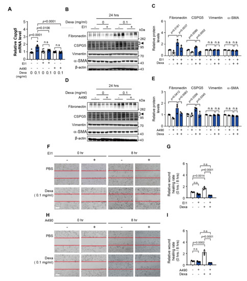 Effect of inhibition of CSPG5-related transcription factors in dexa-induced cells. (A) HLE-B3 cells were pretreated with EI1 and A490 (10 μM) and cultured in a medium with dexa (0.1 mg/mL) for 4 h. mRNA expression levels of CSPG5 were analyzed by qRT-PCR (n = 7). (B) HLE-B3 cells were pretreated with EI1 (10 μM) and cultured in a medium with dexa (0.1 mg/mL) for 24 h. Representative western blot image of EMT marker expression in transcription factor-inhibited HLE-B3 cells. Arrowhead represents CSPG5. (C) Graph showing the relative quantification of protein expression levels of fibronectin, CSPG5, vimentin, and α-SMA (n = 3). (D) HLE-B3 cells were pretreated with A490 (10 μM) and then cultured in a medium with dexa (0.1 mg/mL) for 24 h. Representative western blot image of EMT marker expression in transcription factor-inhibited HLE-B3 cells. (E) Graph showing the relative quantification graph of protein expression levels of fibronectin, CSPG5, vimentin, and α-SMA (n = 3). (F) HLE-B3 cells were pretreated with EI1 (10 μM) and then cultured in a medium with dexa (0.1 mg/mL) for 8 h. The effect of EZH2 inhibition on the dexa-induced cell migration was measured by wound healing assay. (G) Relative healing rates are represented as a rate of the initial wound area at 0 h compared to 8 h (n = 3). (H) HLE-B3 cells were pretreated with A490 (10 μM) and then cultured in a medium with dexa (0.1 mg/mL) for 8 h. The effect of B-MYB inhibition on the dexa-induced cell migration was measured by wound healing assay. (I) Relative healing rates are represented as a rate of the initial wound area at 0 h compared to 8 h (n = 3). Data are represented as means ± S.E.M. p < 0.05 was the significance threshold. EI1, EZH2 inhibitor. A490, B-MYB inhibitor.