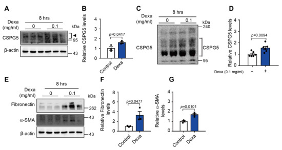 To verify the dexa-induced CSPG5 expression in the human lens, the primary human LEC were cultured with dexa. Dexa significantly increased the protein expression of CSPG5 in cells cultured for 8 h (Figure 5A,B). Dexa also significantly increased the protein expression of CSPG5 with chondroitinase (Figure 5C,D). Furthermore, dexa increased the protein expression of both fibronectin and α-SMA, an EMT marker, in these cells (Figure 5E–G). These results indicate that dexa induces CSPG5 expression and affects cell migration in primary human LEC.