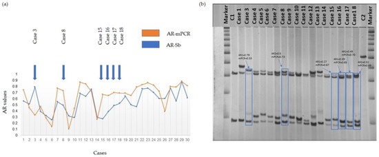 (a) Graphical representation of the distribution of AR values for all 30 participants obtained using the two different methods. (b) Southern blots (Sb) of a representative selection of a subgroup of the cohort included in this study. Cases showing a significant difference in the AR as measured via the two methods, AR-Sb and AR-mPCR, are indicated. Molecular data and case numbers for 30 PM female participants are presented in Table S1. Marker = 1 Kb DNA size ladder marker; C1, normal female, negative control, and C2, full mutation male, positive control. Supporting data are provided in Table S1.