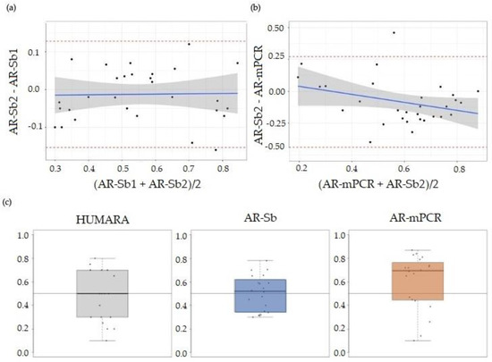 (a) Bland–Altman plot of AR-Sb1 and AR-Sb2 (repeated Southern blot measurements). The red dashed lines indicate two standard deviations from the mean difference. The blue line shows a linear regression fit of the difference between measurements via the mean of the measurements. (b) Bland–Altman plot of AR-Sb and AR-mPCR. The red dashed lines indicate two standard deviations from the mean difference. The blue line shows the linear regression fit of the difference between methods via the mean of the methods. (c) Boxplot of XCI and AR using Southern blot or mPCR for all individuals with an informative HUMARA assay (n = 20). Heavy lines on each box show the group median, lower and upper box edges show the 25th and 75th percentiles, respectively, and lower and upper “whiskers” show the smallest and largest observations, respectively, that lie within 1.5 interquartile ranges (IQR) of the box edges. Observations lying more than 1.5 IQR from the box edges, if any, are shown as points.