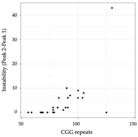 Scatterplot of instability (measured as peak 2–peak 1) as a function of the number of CGG repeats. The statistical details are shown in Table S2.
