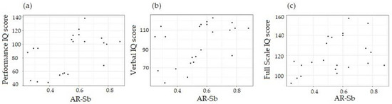 Importantly, the linear regression analysis showed that carriers of PM alleles with higher AR-Sb had significantly higher PIQ and VIQ scores and FSIQ, (p values of 0.02, 0.02, and 0.042, respectively, as shown in Figure 5).