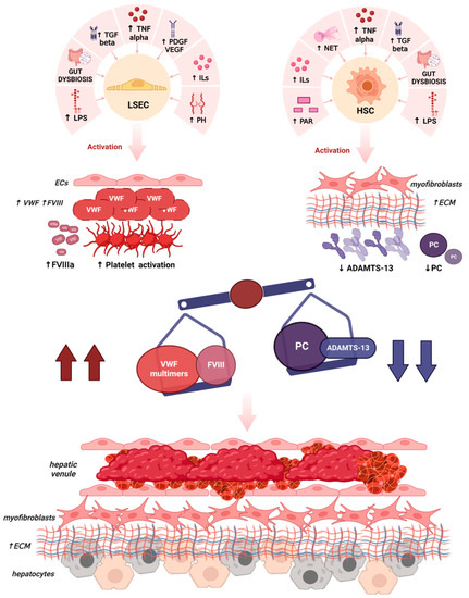 Main mechanisms leading to microvascular thrombosis and parenchymal extinction in liver cirrhosis. In the presence of low-grade chronic inflammation, liver sinusoid endothelial cells acquire vascular endothelial cells phenotype, upregulating the production and release of VWF in the form of HMWVWF multimers and FVIII. Several mediators contribute to this process, such as interleukins (IL6, IL8), chemokines (TNF), growth factors (PDGF, VEGF, and TGF beta), gut dysbiosis, and gut microbiota-derived products (LPS). The same and other factors, such as NET and PAR 1, may also induce significant alterations in HSCs, leading to a myofibroblastic phenotype with expression of alpha-SMA, procollagen, and a poor ability to produce ADAMTS-13, the protein that cleaves the HMWVWF multimers in normal conditions. In liver disease, lower levels of other anticoagulants, such as PC, are also reported. As a result, there is an imbalance between procoagulant factors such as FVIII and VWF and anticoagulant factors such as ADAMTS-13 and PC. HMWVWF multimers, not inhibited by ADAMTS-13, bind activated platelets forming microthrombi. Microthrombi deposition prevalently occurs near the small branches of the hepatic venules, causing the destruction of hepatocytes in a process named “parenchymal extinction”, leading to the worsening of liver fibrosis.