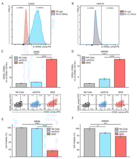 BiKE-mediated activation of NK cells was assessed in co-culture with two established patient-derived glioma xenograft lines, GBM6 and GBM39. GBM6 is a high IL13Rα2 expressing GBM cell line (Figure 2A); GBM39 is a low IL13Rα2-expressing GBM cell line (Figure 2B). Therefore, the selection of these two cell lines permitted the testing of BiKE’s sensitivity to its target, IL13Rα2.