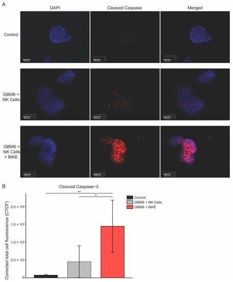 Co-culture experiments of PBMC-derived NK cells and GBM6 spheroids were performed as previously described. After 24 h of treatment with BiKE, cells were spun down at 350 RCF for 5 min, resuspended in 4% PFA, and left at room temperature for 15 min. Cells were washed thrice with 1% bovine serum albumin (BSA)/PBST (PBS with 0.3% Tween 20). Cells were permeabilized with 0.1% triton X-100 (Lot SLCJ6163; Sigma-Aldrich) in PBS for 10 min at RT. Cells were washed thrice with PBST and blocked with 5% BSA/0.3% triton X-100/PBS at RT for 60 min. Cells were washed three times and incubated with Caspase-3 antibody (Rabbit pAb Caspase-3, ab4051, lot GR3359534-3; Abcam) (1:250 dilution in 1% BSA/0.3% triton X-100/PBS) overnight in the dark at 4 °C. Cells were washed five times and incubated with secondary antibody (Alexa Fluor 647 goat anti-rabbit IgG H+L], A-21244, lot 2390713; Invitrogen) (1:1000 dilution in 1% BSA/0.3% triton X-100/PBS) at RT for two hours. Cells were washed three times with PBST, transferred into cytospin funnels (EZ Double Cytofunnel, Cat A78710005, Lot 22035A0; Epredia, Kalamazoo, MI, USA), and spun at 250 RCF for 2 min (Thermo Scientific Cytospin 4). Slides were mounted with ProLong Gold Antifade with DAPI (Cat P36931, Lot 2478336; Invitrogen), and fluorescence was read with a Leica DMi8 microscope (Leica Microsystems, Wetzlar, Germany). Subsequent analysis of images was performed using ImageJ software (version 1.53t, National Institutes of Health, Bethesda, MD, USA). Spheres were included in quantification if greater than 100 μm, did not appear flat, and had a strong distribution of DAPI. DAPI blue fluorescence was adjusted for a minimum of 15 and a maximum of 252. Caspase-3 red fluorescence was adjusted for a minimum of 7 and a maximum of 71. Corrected total cell fluorescence (CTCF) was calculated by subtracting the total area of the sphere (assessed via DAPI-staining) multiplied by the mean fluorescence of background readings from the integrated density.