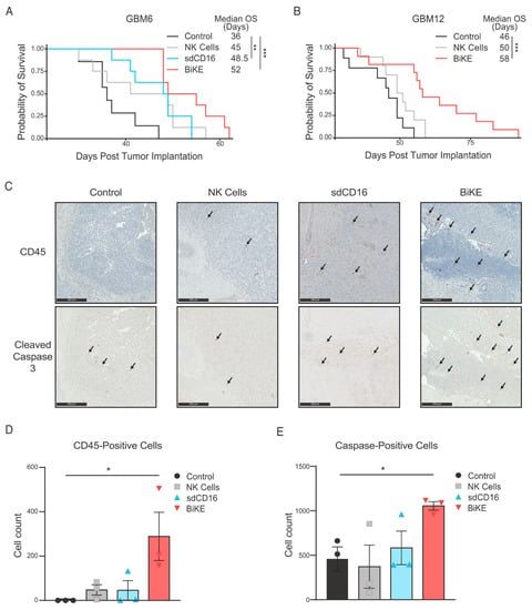 sdCD16 molecule additionally prolonged survival in comparison to controls to 48.5 days, albeit to a lesser degree than BiKE (Figure 4A). BiKE efficacy was tested in a second GBM PDX model, GBM12. BiKE treatment significantly improved the survival of GBM12-bearing mice, with a median survival of 58 days in the BiKE-treated group versus 46 days within control animals (Figure 4B). A separate cohort of twelve mice bearing GBM6 xenografted mice were sacrificed one to three days following treatment with BiTE. The brains underwent immunohistochemical (IHC) analysis to analyze NK cell presence and tumor cell killing. Analysis of human CD45+ cells revealed significantly more NK cells in the tumor of BiKE-treated mice compared to both controls and NK or sdCD16 treatment groups (Figure 4C,D, p < 0.05). Similarly, analysis of cleaved caspase 3 revealed significantly more apoptotic cells in BiKE-treated animals compared to both NK cells alone and controls (Figure 4C,E). Taken collectively, BiKE promotes the persistence of NK cells within the tumor site, increases tumor cell death, and extends survival in GBM-bearing animals.