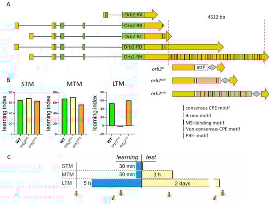 Structure of the orb2 locus and replacements used in the study. (A) Structure of orb2 transcripts. The coding regions are shown with green boxes; the 5′- and 3′UTRs, with yellow boxes. The 3′UTR part deleted in the orb2R strain is shown with red dashed lines. The structure of the modified orb2 locus is given below. The remaining part of the 3′UTR (yellow), the attP site used for integration, the integrated sequences, and the LoxP site (gray rhombus) are also shown. Several regulatory motifs are marked with strips of different colors (see detail in text). (B) Learning indices calculated for short-term (STM), mid-term (MTM), and long-term (LTM) memory. STM and MTM of the orb2tub and orb2orb fly strains were the same as in the WT strain; orb2tub flies showed a significant reduction in LTM formation. (C) Behavioral assessment timeline. The blue bars indicate the learning time, the yellow bars indicate the time before the test, and the red bars indicate the test of the courtship behavior.