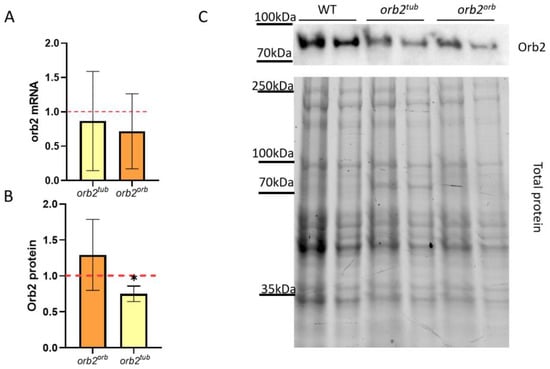 To better understand why LTM formation in orb2tub and orb2orb males is different, we assessed how insertions into the orb2R allele affect the orb2 mRNA level. The relative orb2 mRNA level mRNA was calculated by the ΔΔCt method with gapdh2 used as a reference gene. The results are presented in Figure 2A. We found that the orb2 mRNA level did not differ from the WT level in both the orb2tub and orb2orb fly strains. The same result was observed in the orb2R strain [32]. Thus, the insertion of an additional sequence in place of the deleted part of the orb2 gene does not change the relative production or the stability of the orb2 mRNA.