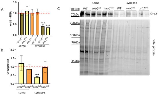 Subcellular distribution of the orb2 mRNA and protein in neurons. (A) Relative levels of the orb2 mRNA were detected in fractions of neurons of the orb2R, orb2tub, and orb2orb fly strains by qPCR. A red dashed line presents the orb2 mRNA level in WT flies, which was used for normalization. Columns show the mean mRNA levels detected in orb2R, orb2tub, and orb2orb (t-test, n = 8, SD is shown). Asterisks show significant changes (p < 0.001) in the orb2 mRNA level in the synaptic fractions of the orb2R and orb2tub strains. (B) Relative mean levels of the Orb2 protein in the soma and synaptic fractions from orb2tub and orb2orb flies. A red dashed line presents the Orb2 protein level in WT flies, which was used for normalization. Flies of the orb2tub strain showed a decrease in Orb2 protein amount (n = 6, SD is shown, asterisks show p-value < 0.01), while orb2orb flies had the same Orb2 protein level as WT flies. (C) The top panel shows an example of staining the fractions from different fly strains with anti-Orb2 antibodies. Each sample was examined in a twofold dilution as well. The bottom panel shows the total protein.
