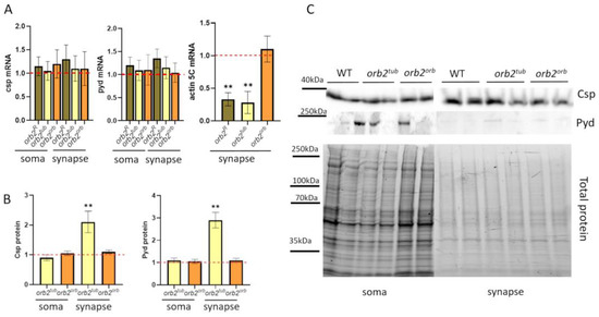 Next, we examined the distribution of Csp and Pyd proteins in the soma and synaptic fractions. In the orb2orb sample, the levels of the proteins were the same as in the WT flies. However, in orb2tub samples, the levels of the proteins were elevated in the synaptic fraction compared with the WT (Figure 6B). Similar results have been obtained previously for the orb2R deletion [32].